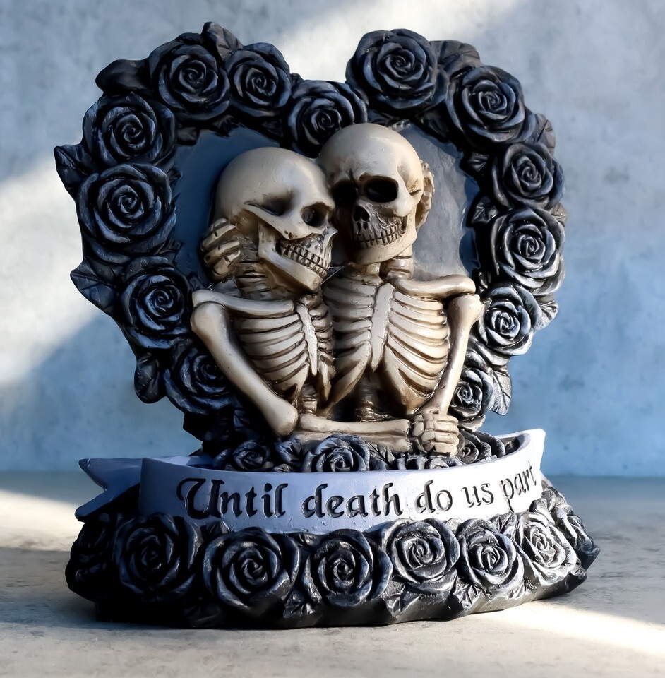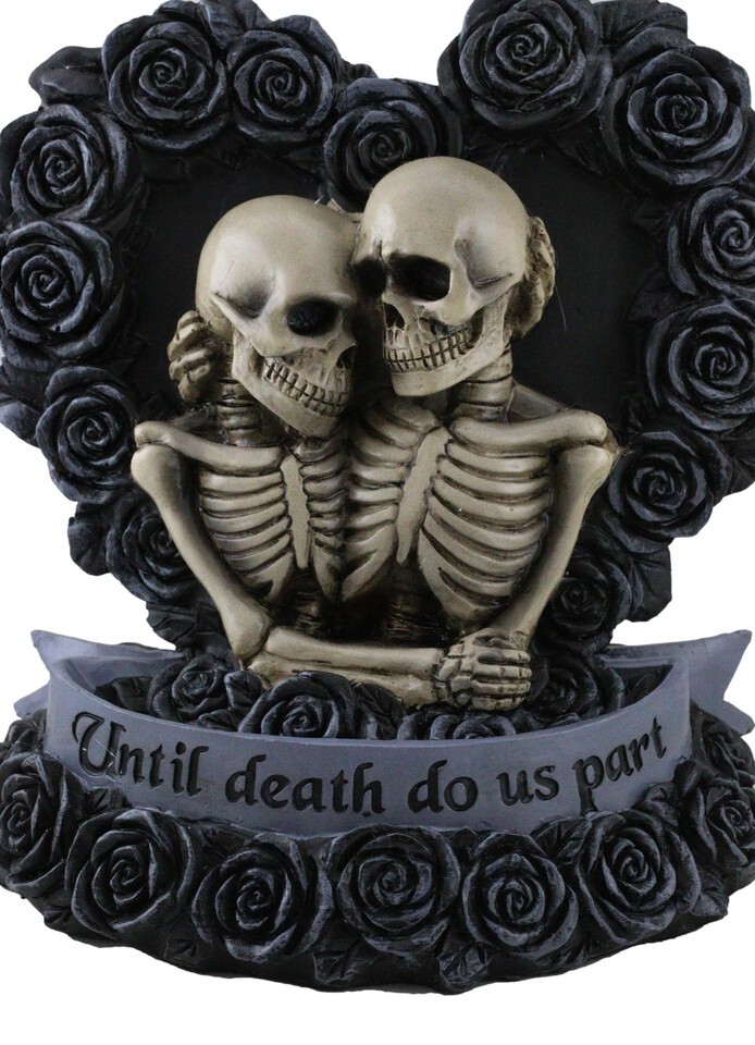 ? This Skeleton Wedding Couple is a perfect wedding anniversary gift as well as an awesome decor for the day of the dead celebration. It features an adoring couple, embracing each other side by side by an altar of black roses aligned in a heart shape. A grey ribbon at the base of the floral altar reads 'Until Death Do Us Part'. They have in essence made a 'Deadly Promise'.