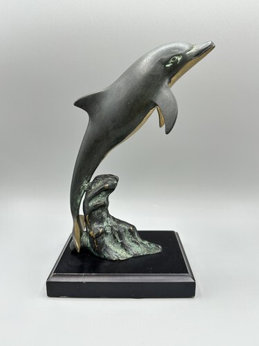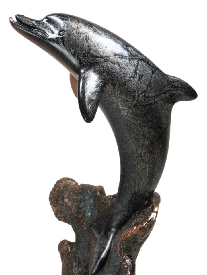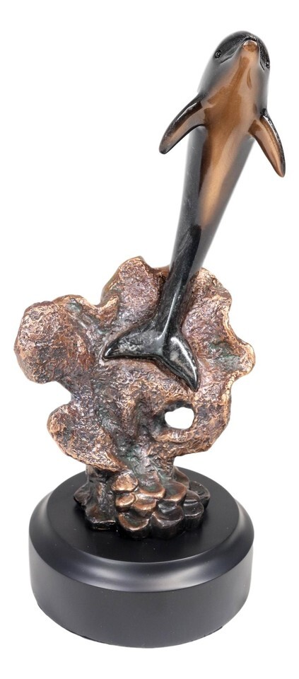 ? This Bottlenose Dolphin figurine is made of the highest quality resin, undergoing the process of bronze electroplating giving it a uniform shine on the inside as well as the surface of the figurine. This process makes the figurine resemble the look of actual bronze but with much lesser weight.This figurine is designed with a matching base to beautifully decorate your office, home and space. To add sculptural aesthetics and display worthiness, we add accent black plastic bases to the sculpture.
