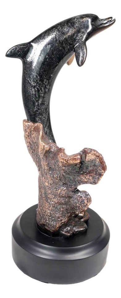 ? Hear the call of the ocean with this breathtaking sculpture featuring a bottlenose dolphin jumping out of the waters. The fast leaping dolphin takes with him a huge wake, creating a mighty splash. Our impressive, 360-degree, bronze electroplated resin statue is expertly finished with a hand-applied, classic sepia bronze patina and polish to bring out the amazing detail.