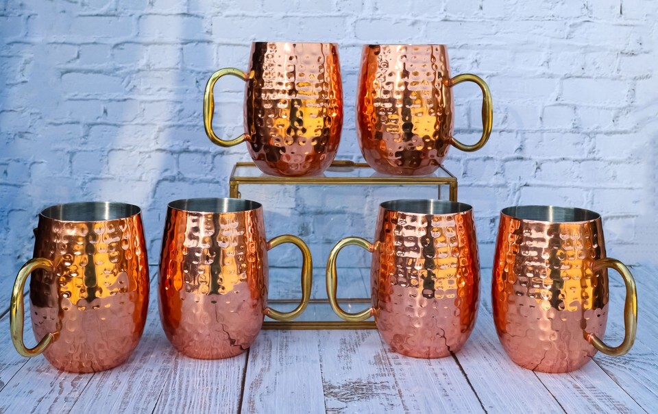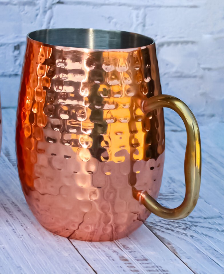 ? Premium Moscow Mule cups, ideal stainless steel kitchen accessories, beautifully handcrafted by our expert metalsmiths! Our 22-gauge thick Moscow Mule cocktail glasses will keep your drinks cold! It also features a smooth rounded rim top and a hammered ridged body. The luxurious curved handle is finished in gold color.