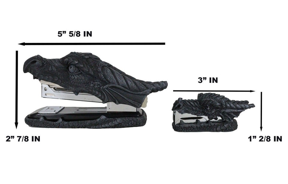 ? This Smaug Fire Dragon Stapler is approximately 3" tall and 6" long and 1.25" deep. Its accompanying dragon head staple remover measures 2" tall, 3" long and 1" deep approximately.