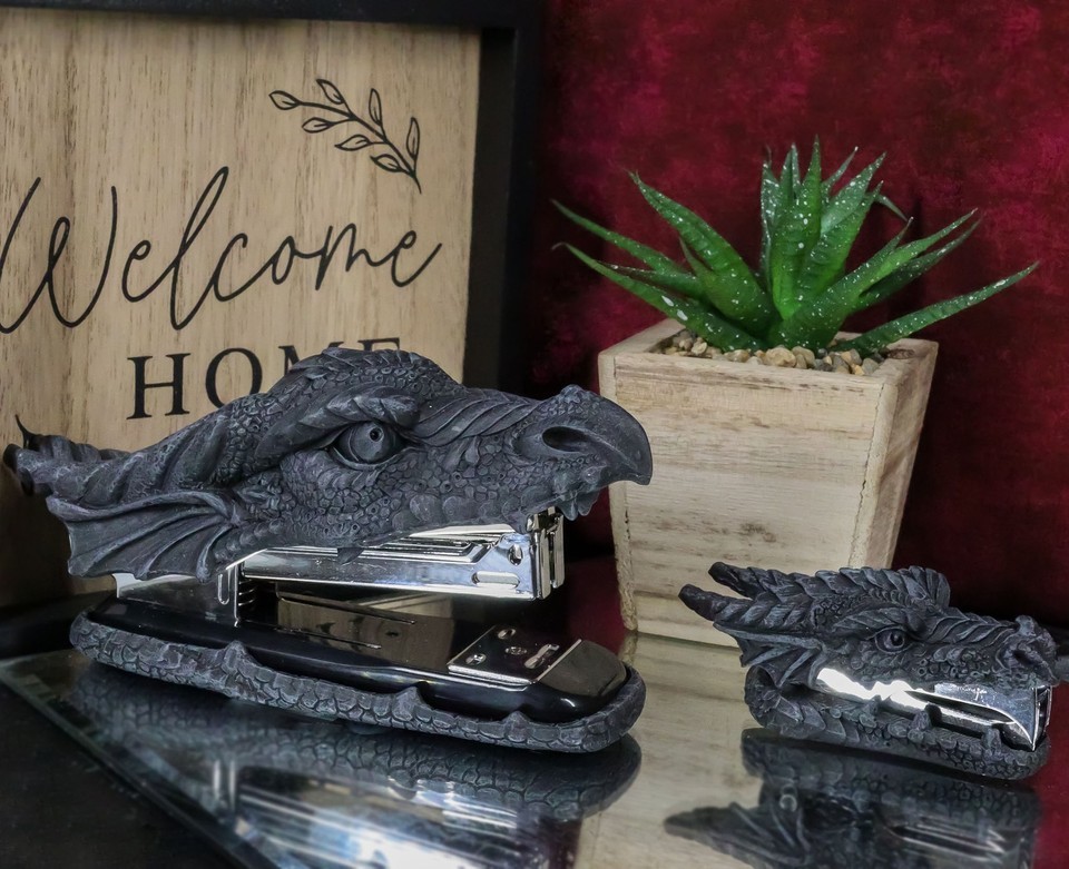 ? Bring life and style to an office accessory with this dragon stapler and matching staple remover. Cast in resin with faux stone finish, this dragon is a mean flame thrower. The dragon stapler and staple remover are sturdy to the touch and ergonomic for light duty use.