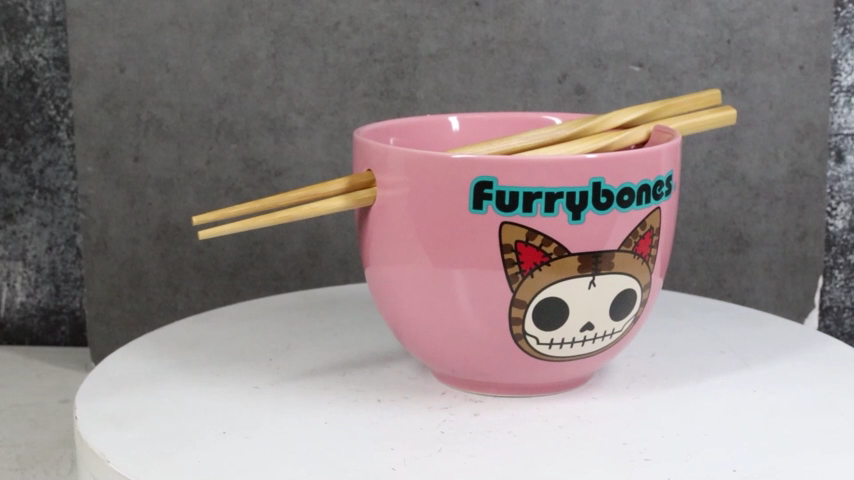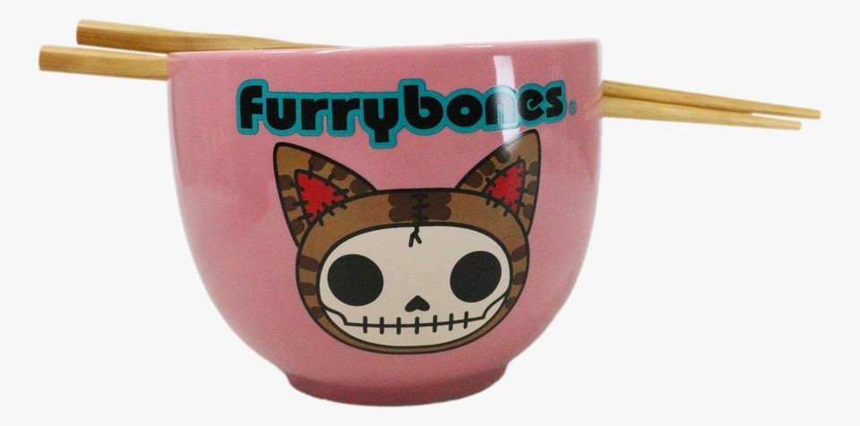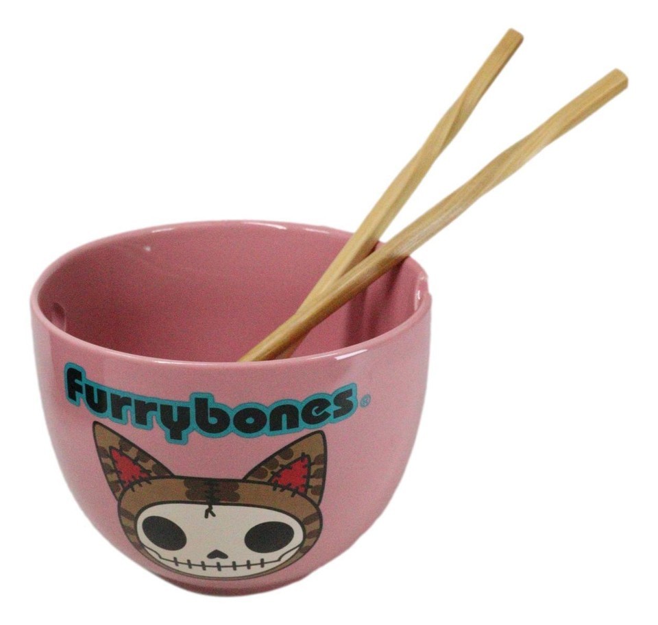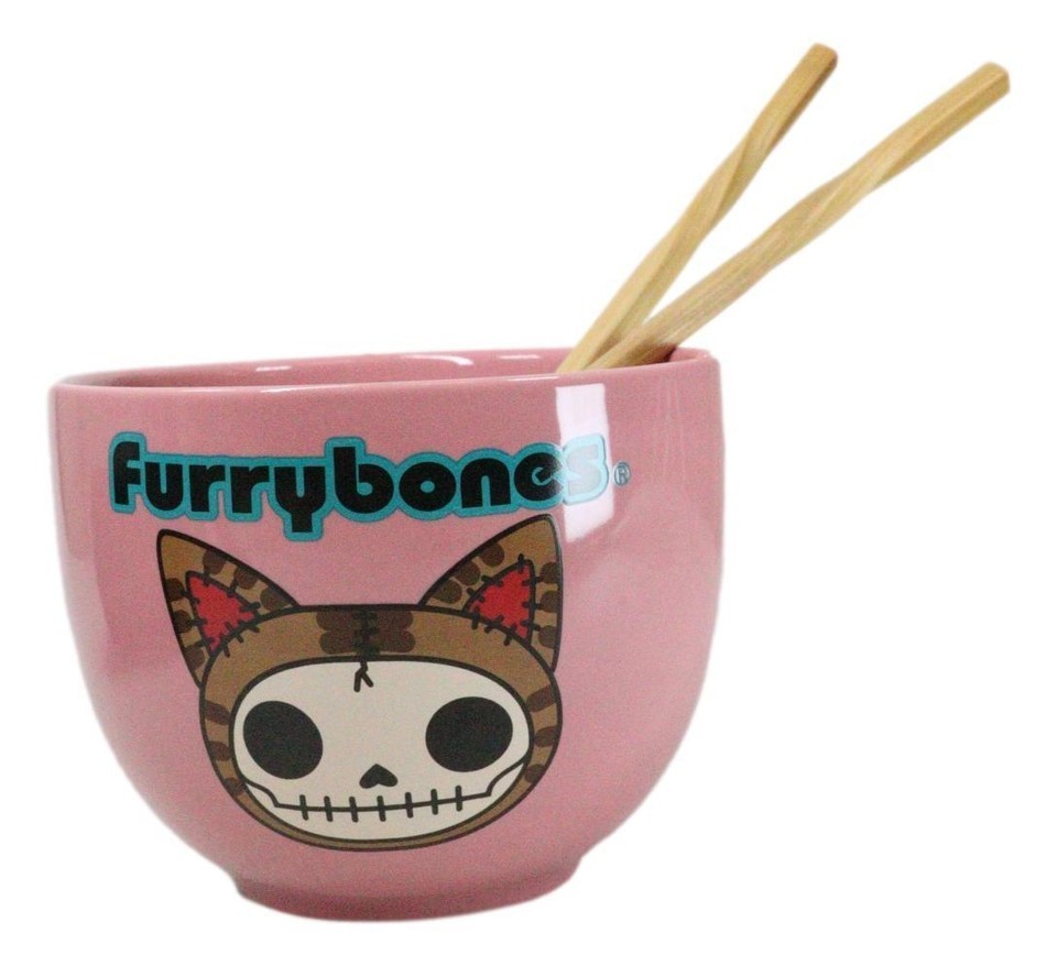Furrybones Maneki Neko Cat Skeleton Pink Porcelain Bowl With Chopsticks Set