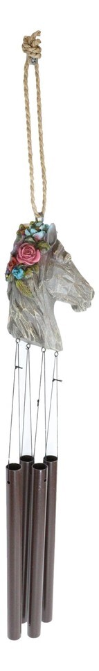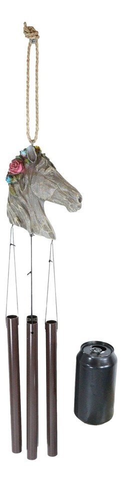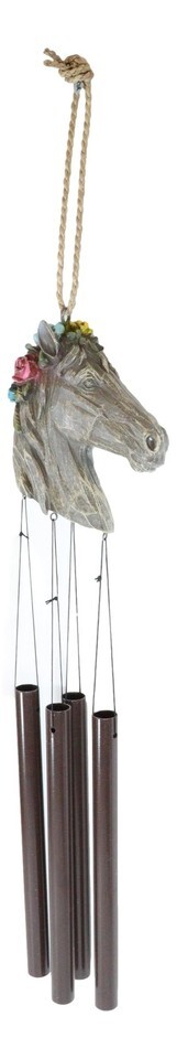 ? Designed as a vintage horse bust with floral arrangements at the ears, the sculptural wind chime crown holds several aluminum chime tubes.