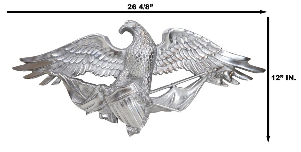 Large 26" Polished Aluminum Bald Eagle Clutching USA Flags And Crest Wall Decor