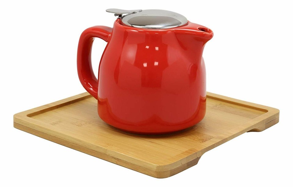 Bright Red Contemporary Ceramic 20oz Tea Pot With 2 Cups And Bamboo Tray Set