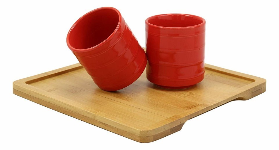 ? We present to you a beautiful modern contemporary tea set consisting of colorful tea pot and two matching cups in design and color. We also provide you with an accent bamboo tray for a traditional ceremony of tea with your guests and loved ones.