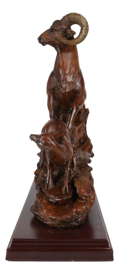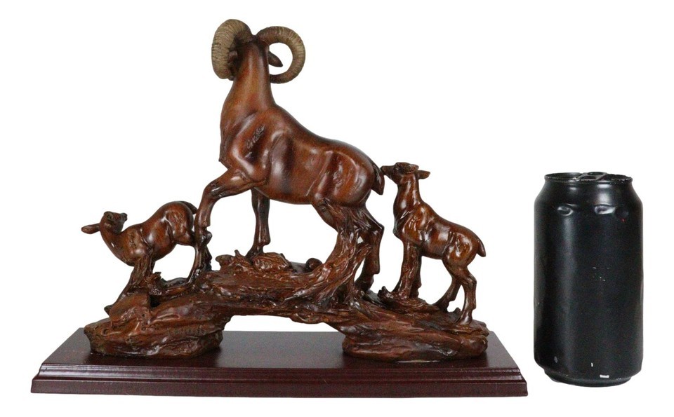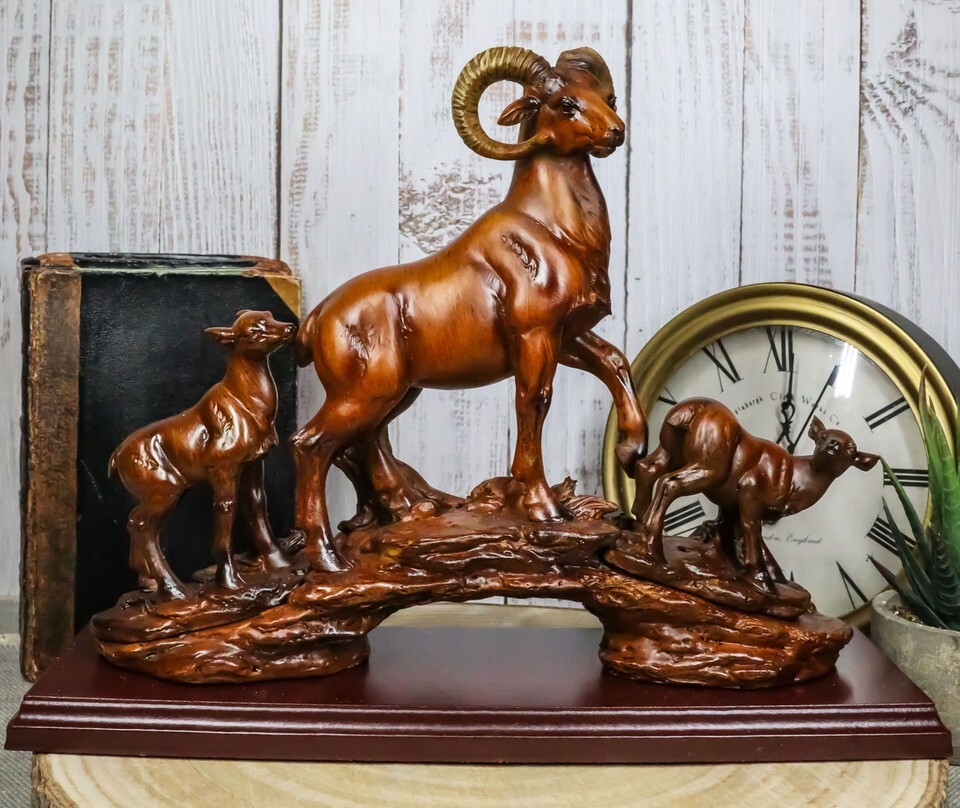 Rustic Country Bighorn Sheep Ram With Lambs On Rock Faux Mahogany Wood Figurine