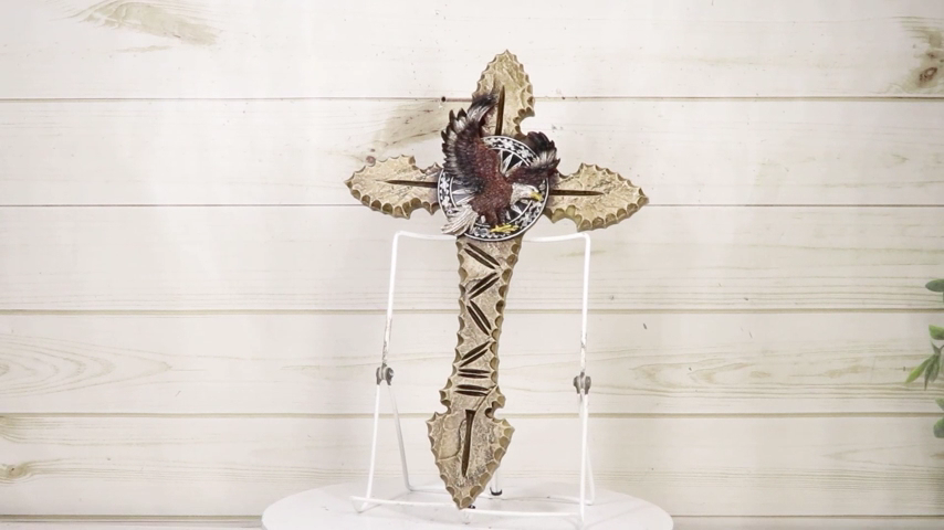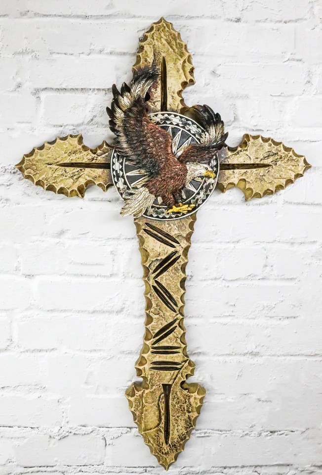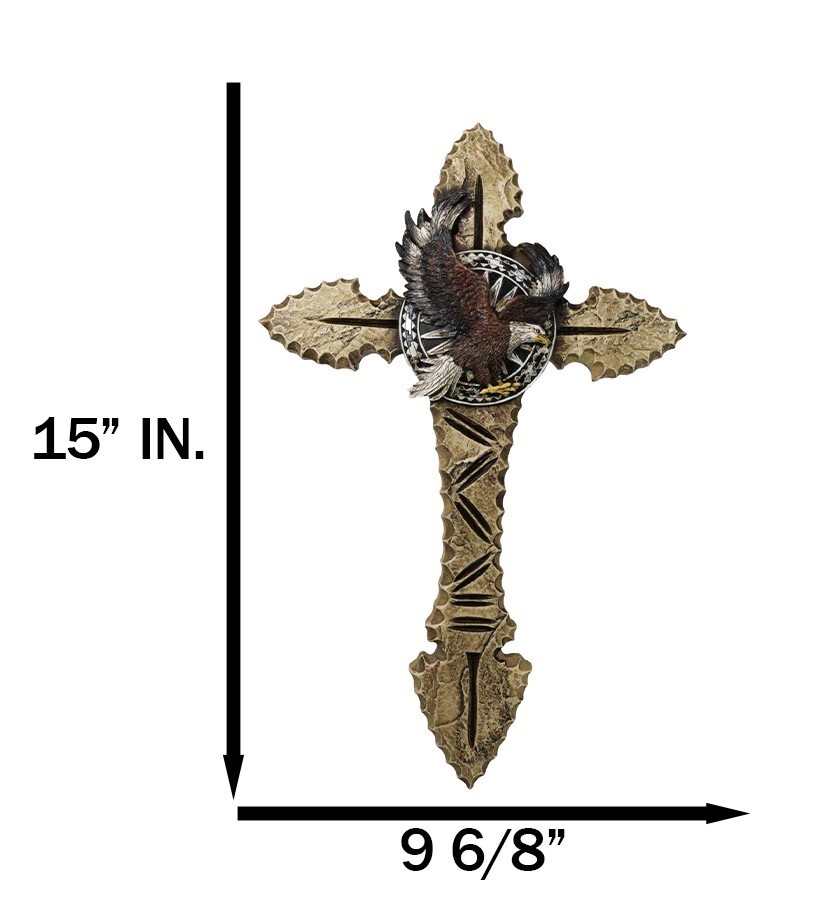? Add a touch of Southwestern heritage to your decor with the Faux Wooden Tribal Arrows with Bald Eagle Medallion Wall Cross. This striking piece features intricately designed faux wooden tribal arrows, symbolizing strength and direction. At the heart of the cross is a majestic bald eagle, representing freedom and power, along with a medal insignia that adds an element of honor and distinction.