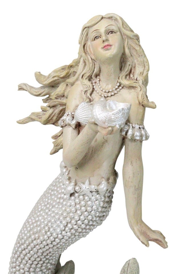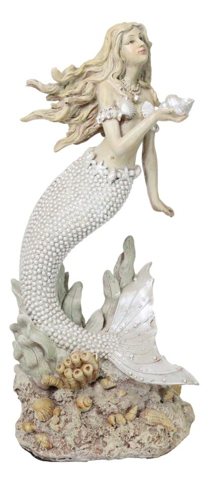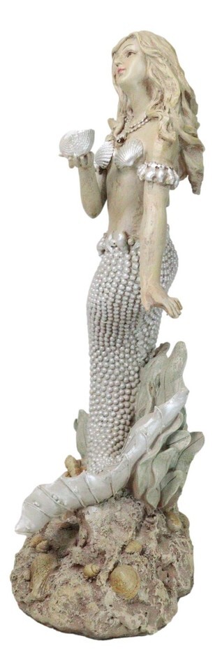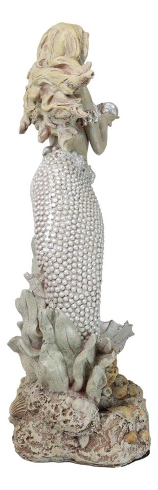 ? Elevate your coastal decor with our Vintage Mermaid Figurine. This stunning piece depicts the enchanting sea goddess Venus, adorned with a beaded pearl tail, gracefully holding a sconce. Standing majestically by a coral reef, this figurine captures the timeless beauty and mystery of the ocean. Perfect for coastal and nautical-themed interiors, this exquisite sculpture adds a touch of elegance and whimsy, making it a captivating centerpiece for any home or office.
