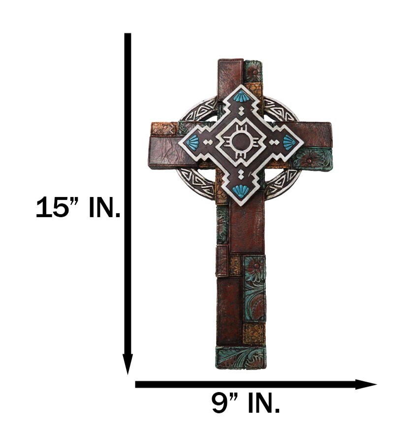 ? Elevate your home decor with the Southwestern Aztec Wheel Trinity Floral Accents Tooled Faux Leather Wall Cross. This exquisite piece showcases intricate Aztec vector patterns and a symbolic trinity wheel, beautifully accented with turquoise floral details. Crafted with a tooled faux leather finish, it exudes a rich, rustic charm that blends cultural heritage with spiritual significance.