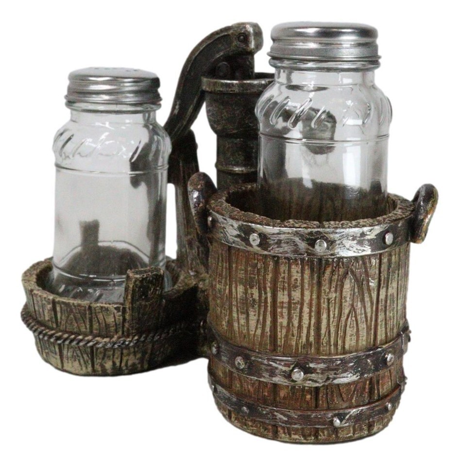 ? Add a touch of rustic charm to your kitchen or dining area with the Old Fashioned Water Pump Sculptural Salt Pepper Shakers Set. This delightful piece features a miniature replica of an old-fashioned water pump, adorned with horseshoes and wooden barrels, capturing the essence of country living. The sculptural display also includes glass salt and pepper shakers, making it both a functional and decorative addition to your table.