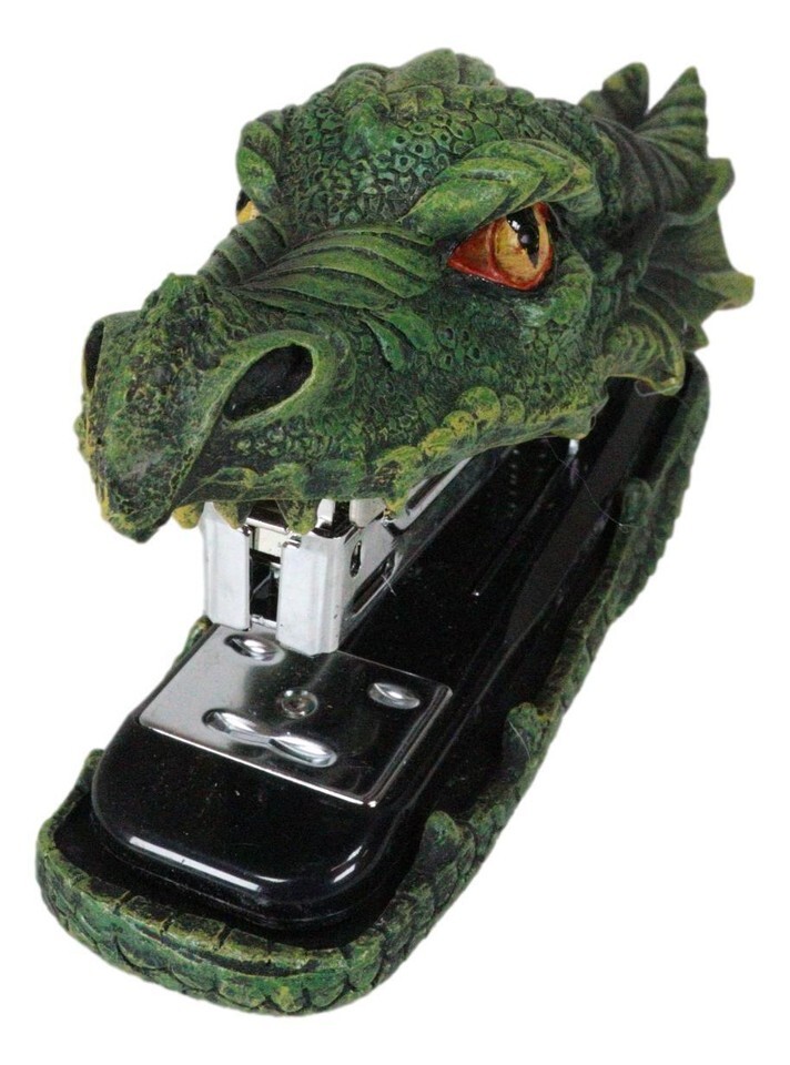 ? Bring life and style to an office accessory with this dragon stapler. Cast in resin with green color base stonelike finish, this dragon is a mean flame thrower. The stapler is sturdy to the touch and ergonomic for light duty use.