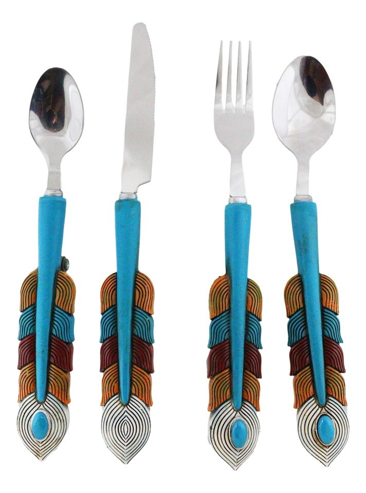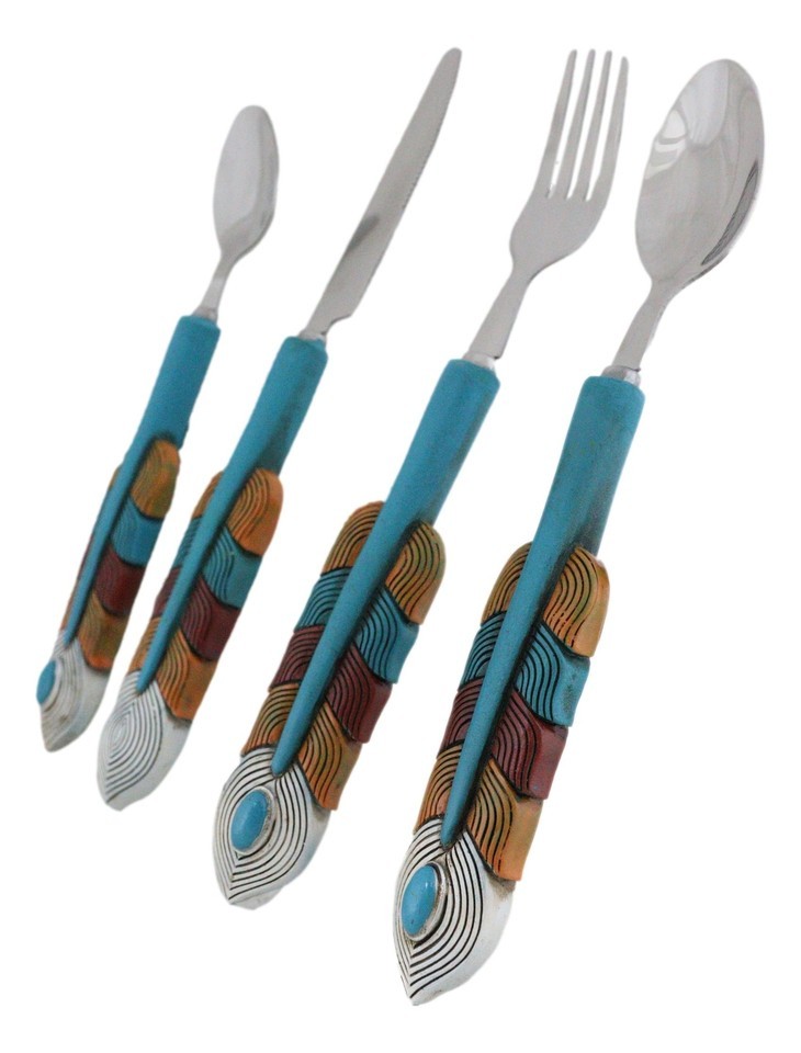 Ebros Southwest Chic Indian Turquoise Feather Flatware 4 Spoon Teaspoon Fork Knife Set