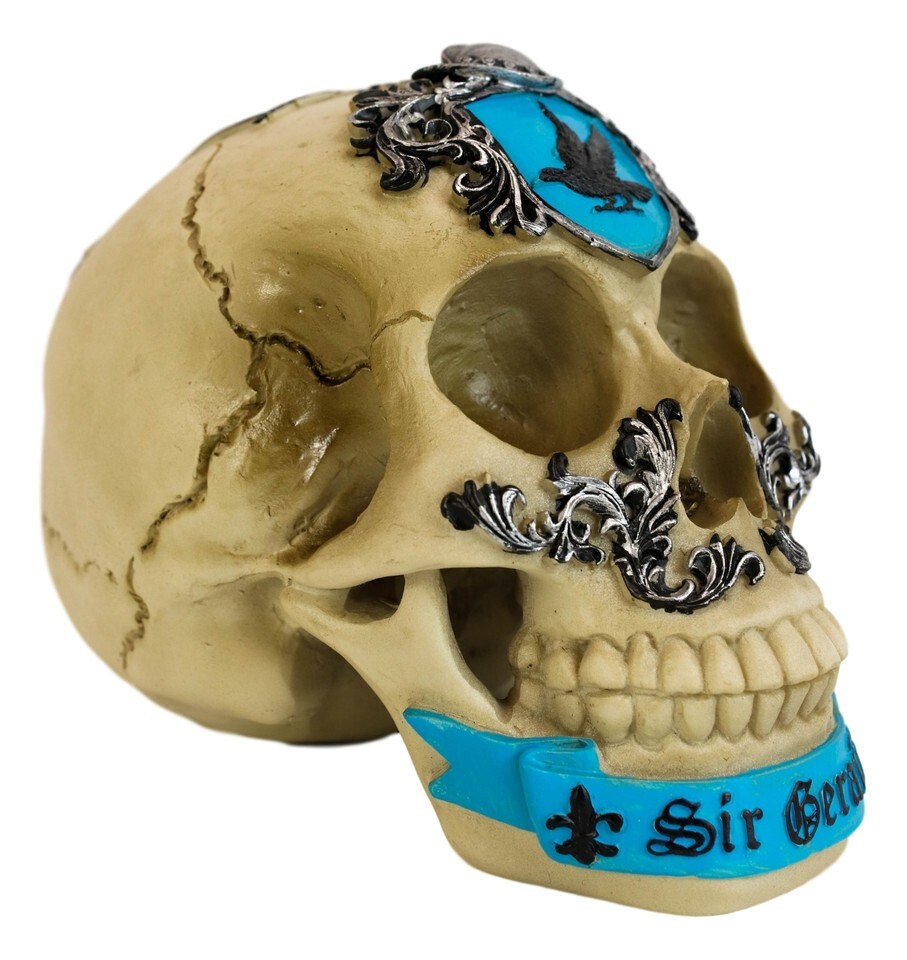 ? The Sir Geraint Skull Statue represents and celebrates one of the legendary Knights of the Round Table. A bright blue, ribbon-style banner along the skulls chin reads SIR GERAINT. Fleur-de-lises sit at the ends of the black words and scrollwork in silver aligns with the cheekbones. Geraint's crest has a black raven on a blue background while the back of the skull has detailing of a flag banner with a red devil crest.