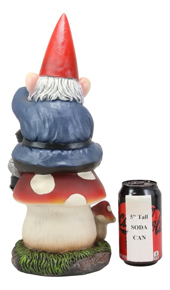 This Large Gnome Sitting On Toadstool Mushroom With LED Lantern Statue measures 15" tall, 6.75" long and 6.5" deep approximately. It weighs about 4 pounds.