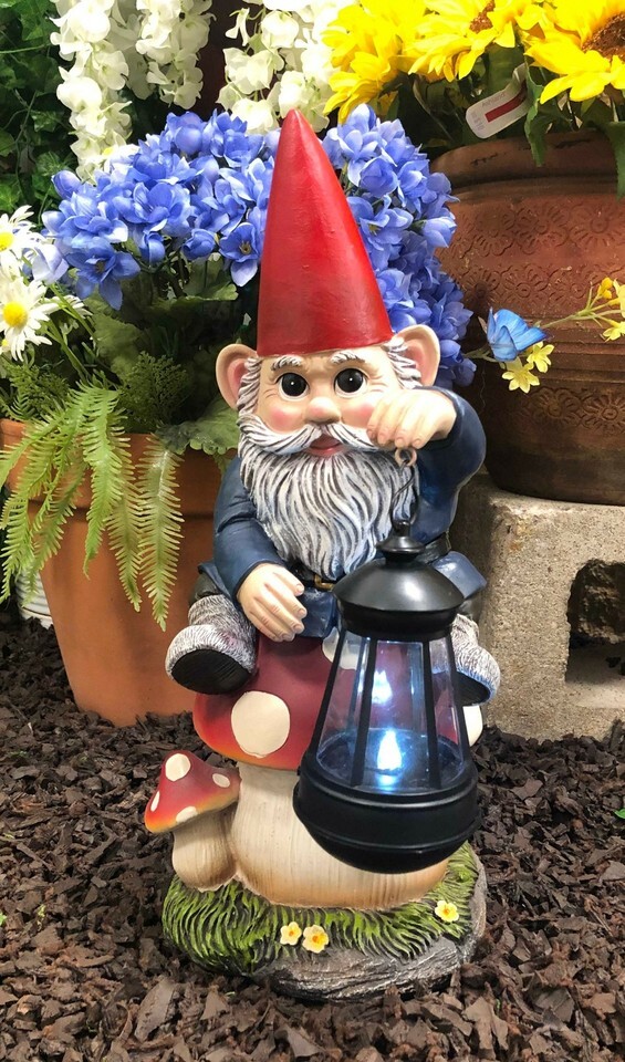 This Large Gnome Sitting On Toadstool Mushroom With LED Lantern Statue is made of cold cast polyresin, hand painted and polished. This Cool White LED lamp figurine is solar powered and it comes on automatically when the sun sets and off when light is present. Solar lantern is equipped with one rechargeable battery.