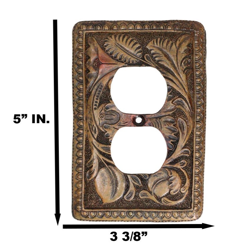 ? This Western Faux Wooden Tooled Floral Blossoms Wall Electrical Cover Plates each measures 5" High, 3.25" Wide and 0.25" thick approximately. They fit standard wall receptacles. Each plate weighs about 5 ounces.