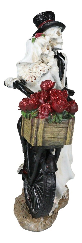 Love Never Dies Skeleton Bridal Couple On Bicycle With Basket of Roses Figurine