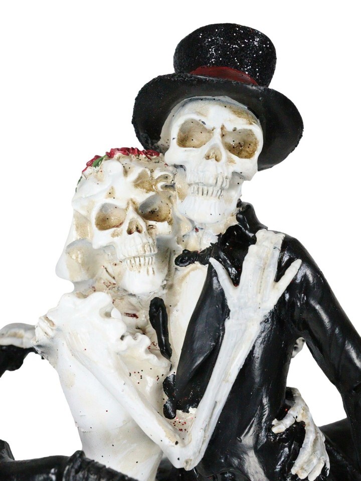 ? This Love Never Dies Wedding Skeleton Couple figurine is made of designer composite resin, hand painted and polished individually. Color Tone may vary slightly from pictures.