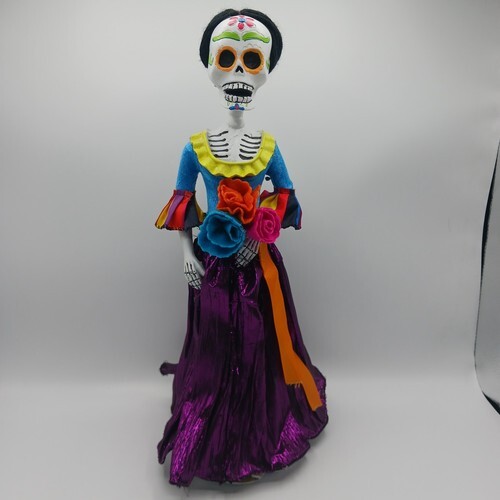 ? This Day Of The Dead Skeleton Couple is a perfect wedding anniversary gift as well as an awesome decor set for Halloween, Gothic Or Dias De Muertos parties and such. This picture perfect bride and groom couple is by their vintage bicycle, still in their wedding outfit, smiling wide and all happy for you. In front of their bike is a Love Never Dies faux wooden basket full of red rose stalks.