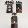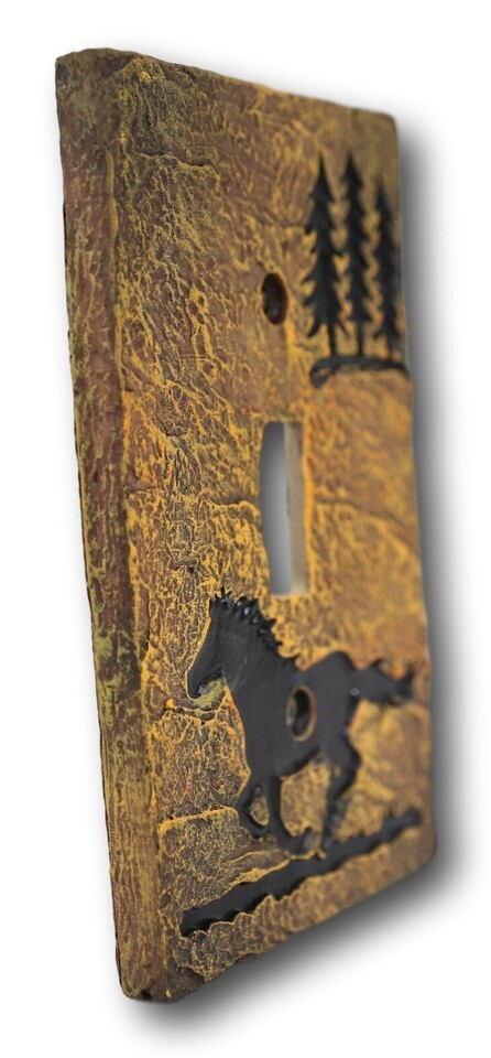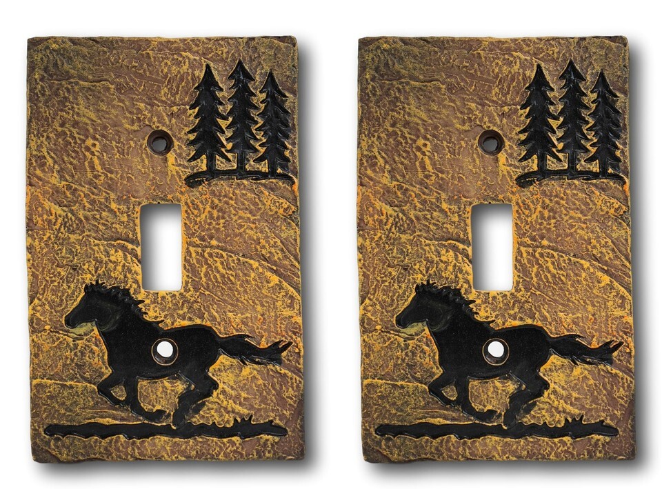 ? It is now very easy to transform your space at your home or office into a rustic Western exotic getaway with these switch/rocker plate covers. These switch plates feature silhouettes of galloping mustang horses and pine trees. The plates' surfaces are textured in earth dust finish of the Wild Western Desert Grasslands.