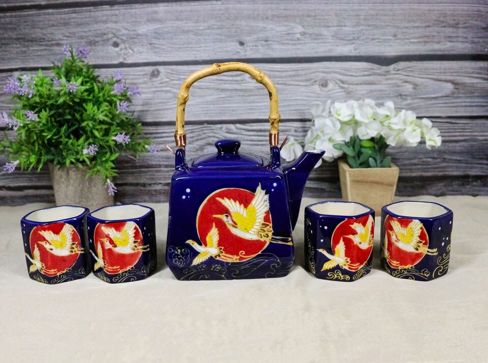 Golden Crane With Red Moon Blue Ceramic Hexagonal Teapot With 4 Tea Cups Set