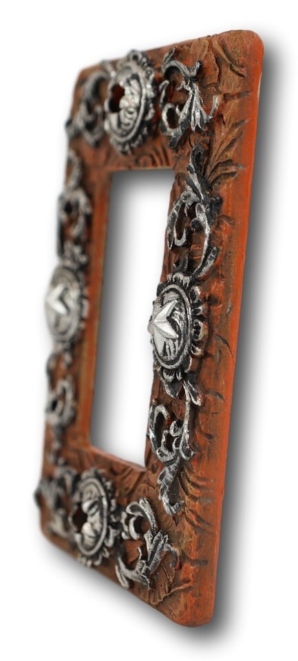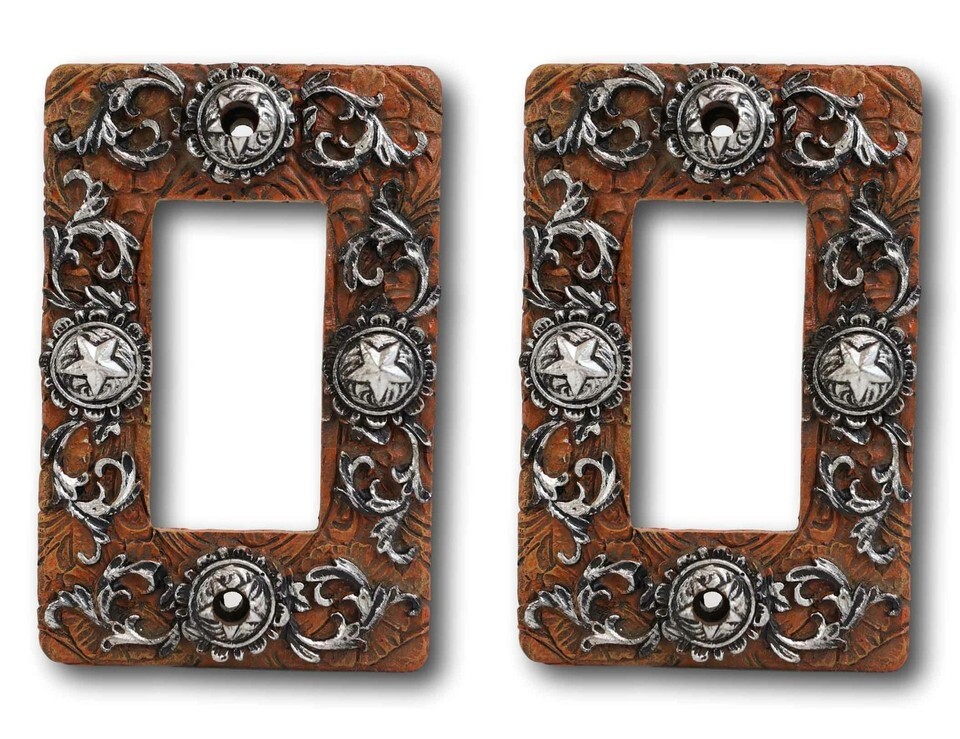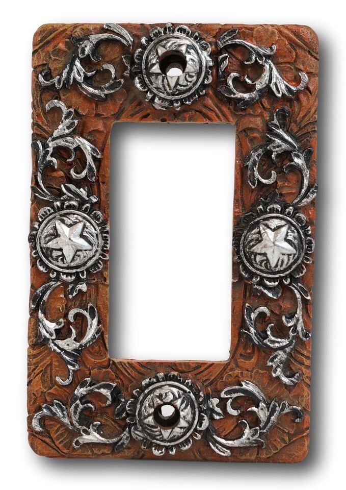 ? It is now very easy to transform your space at your home or office into a rustic Western exotic getaway with these switch/rocker plate covers. Details of faux-tooled leather, silver scrolling and star conchos make these switch plate covers the perfect subtle western accent for your office, bedroom, or kitchen walls.
