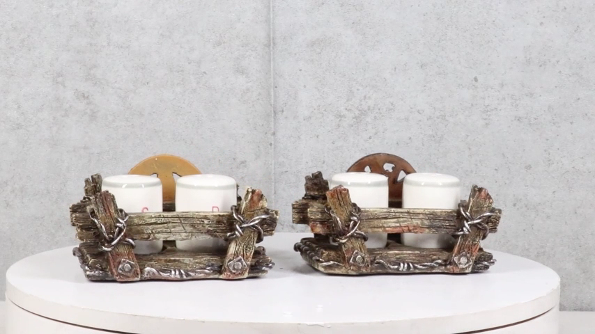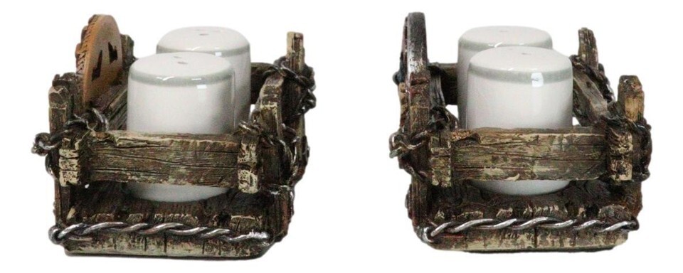 ? This Western Rustic Wagon Wheel salt pepper shakers holder set is made of polyresin, hand painted and polished individually.