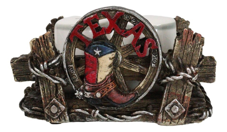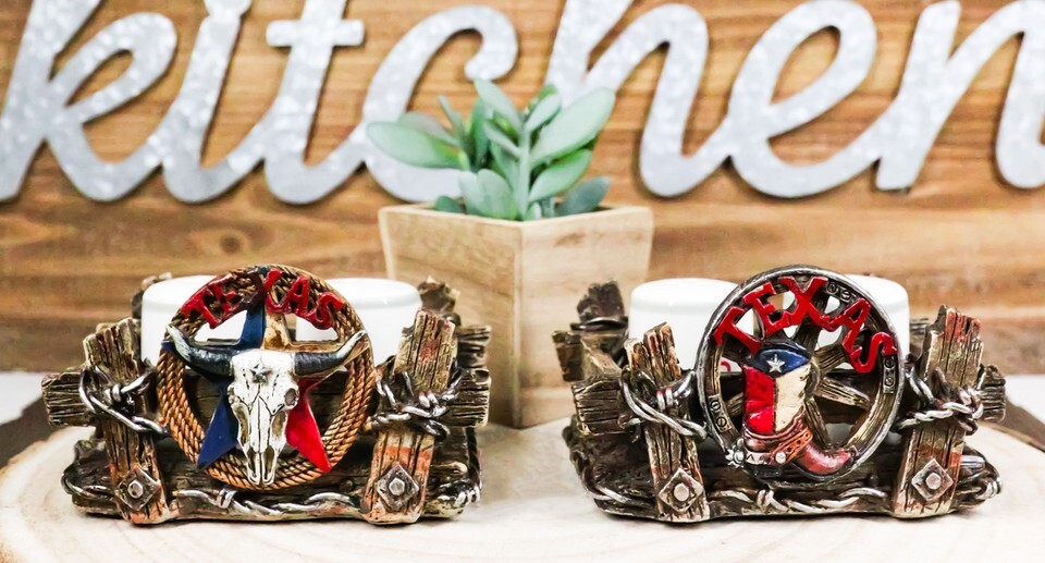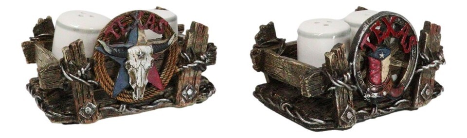 ? Rope a western frontier into your home with these unique wagon wheel With Texas Boot and braided ropes with Texas Longhorn Cow Skull sculptural salt pepper shakers holders.