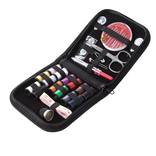 Sewing Kit Contains: Scissors, 2 Safety Pins, 25 Inch Tape Measure, 2 Hand Needles and Threader, 6 Colors of Thread, 2 Straight Pins, 2 White and 2 Black Shirt Buttons.