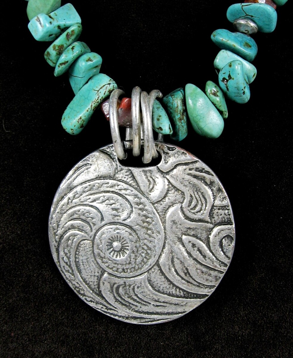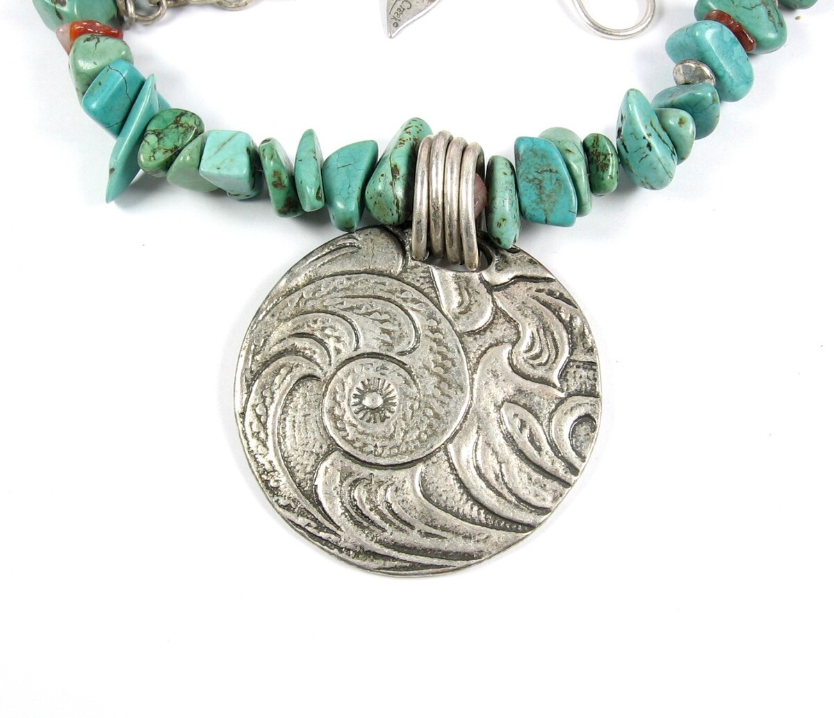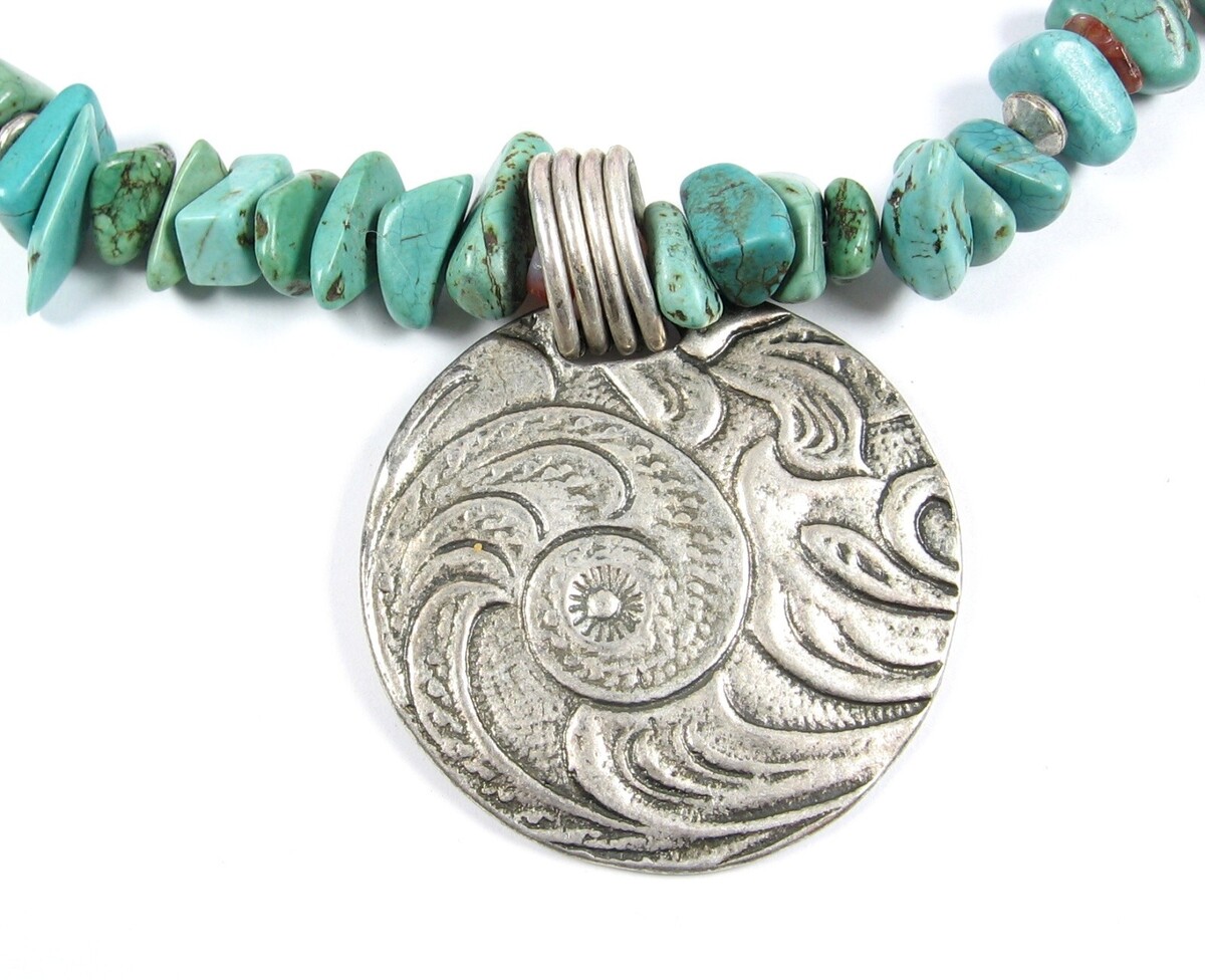 COLDWATER CREEK Vintage Green Turquoise Stone Bead Spiral PENDANT Silvertone 18"
