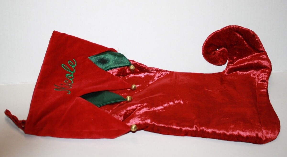 Features: Soft, pretty velvet and satin stocking with Green embroidered monogram "Nicole", embellished with small plastic gold balls, curled toe, velvet hanging loop