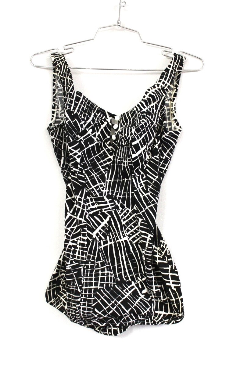 ONE PIECE SWIMSUIT Black & White SZ M VINTAGE 1960's NWOT C-D Bullet Bra Cups