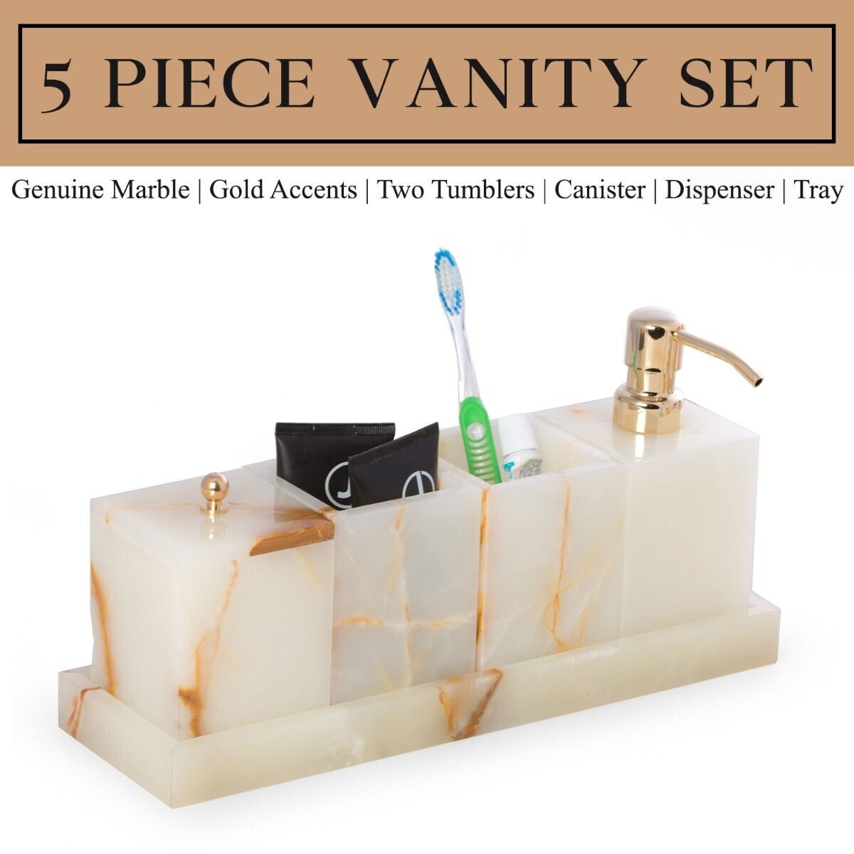 canister with a lid. Vanity 5 Piece Marble Green Onyx Set with 2