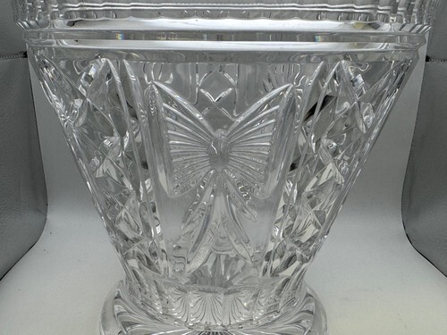 This large champagne bucket measures 10 1/2" in height and 9 3/4" in diameter and is in very good condition with no chips or cracks. It has some minor abrasions on the bottom from use.