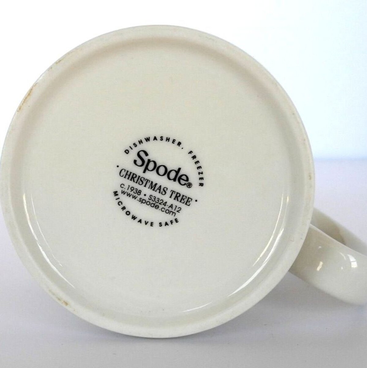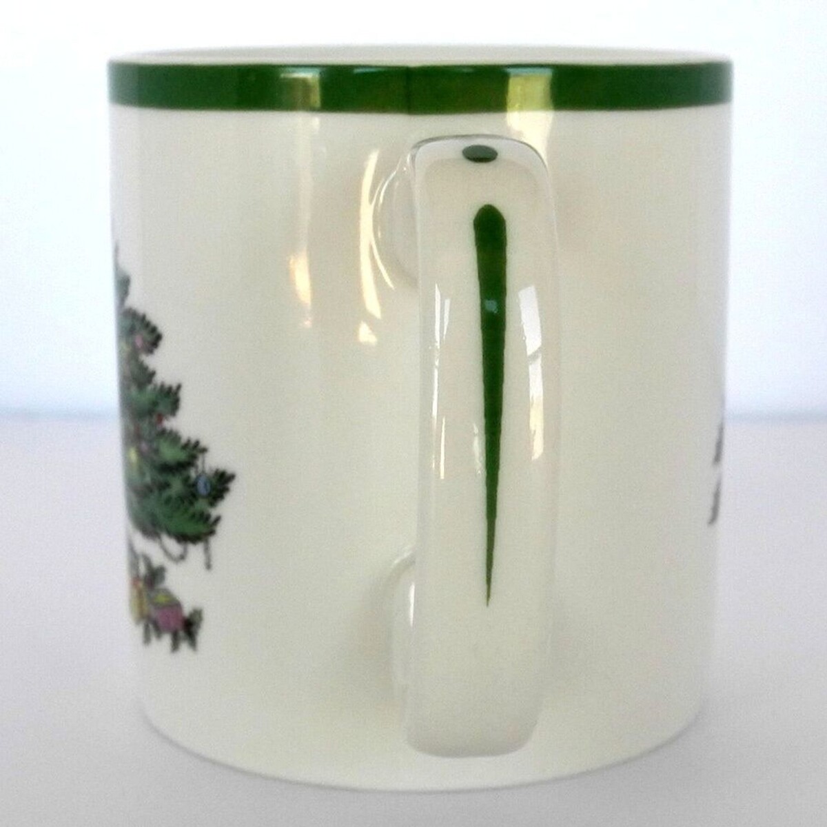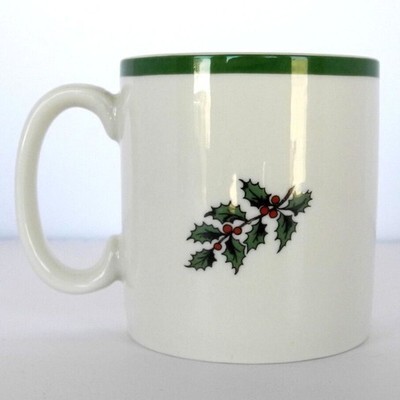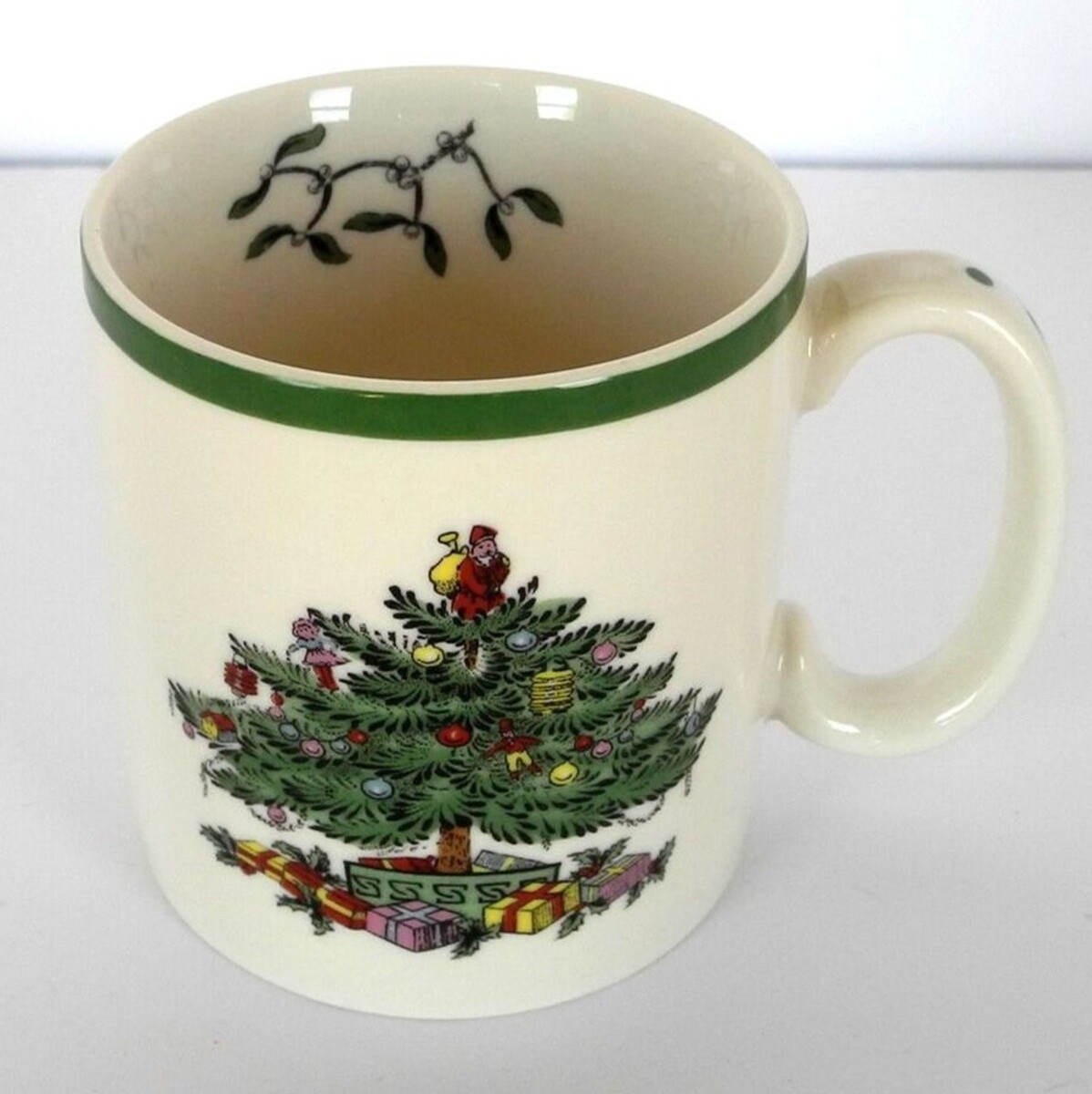 Spode mug with Christmas Tree design. Ivory with Christmas tree on one side and holly on the other. Green trim around top with greenery inside cup and green design on handle. Spode Christmas Tree 1938 S3324-A12 Dishwasher freezer microwave safe. Measures 3" across the top and bottom and is 3-1/4" high. Excellent condition.