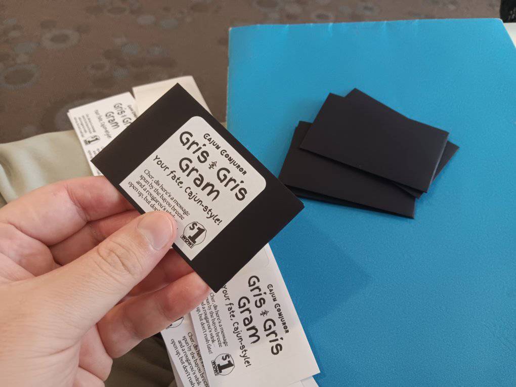 60 individually packaged Gris Gris Grams – Cajun-style fortune! Business card-sized divination with a mystical Louisiana twist MSRP $1 each