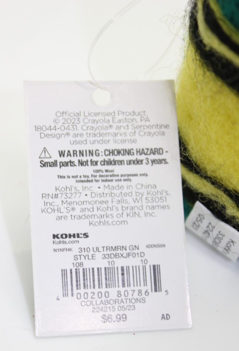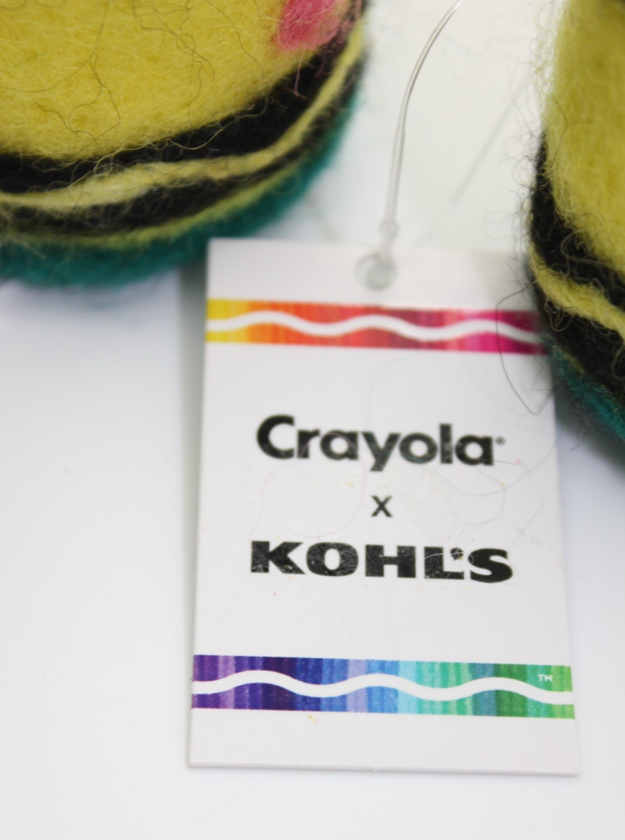 The Crayola Kohl's Collaboration Felt Crayon Plush is a 4" ornament featuring a green and yellow crayon design made of 100% wool felt. This hanging ornament is part of the 2023 release from Crayola, perfect for adding a touch of color and charm to any holiday or seasonal decor. The reusable ornament is adorned with the iconic Crayola character and is ideal for those who appreciate unique and playful home decor accents.