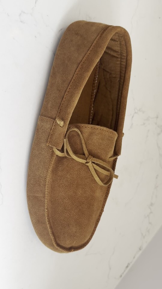 Suede Leather Upper, Stitched moccasin toe, Leather tie detail, Insulated, Anti Slip Sole, Comfort, Warm and Lightweight