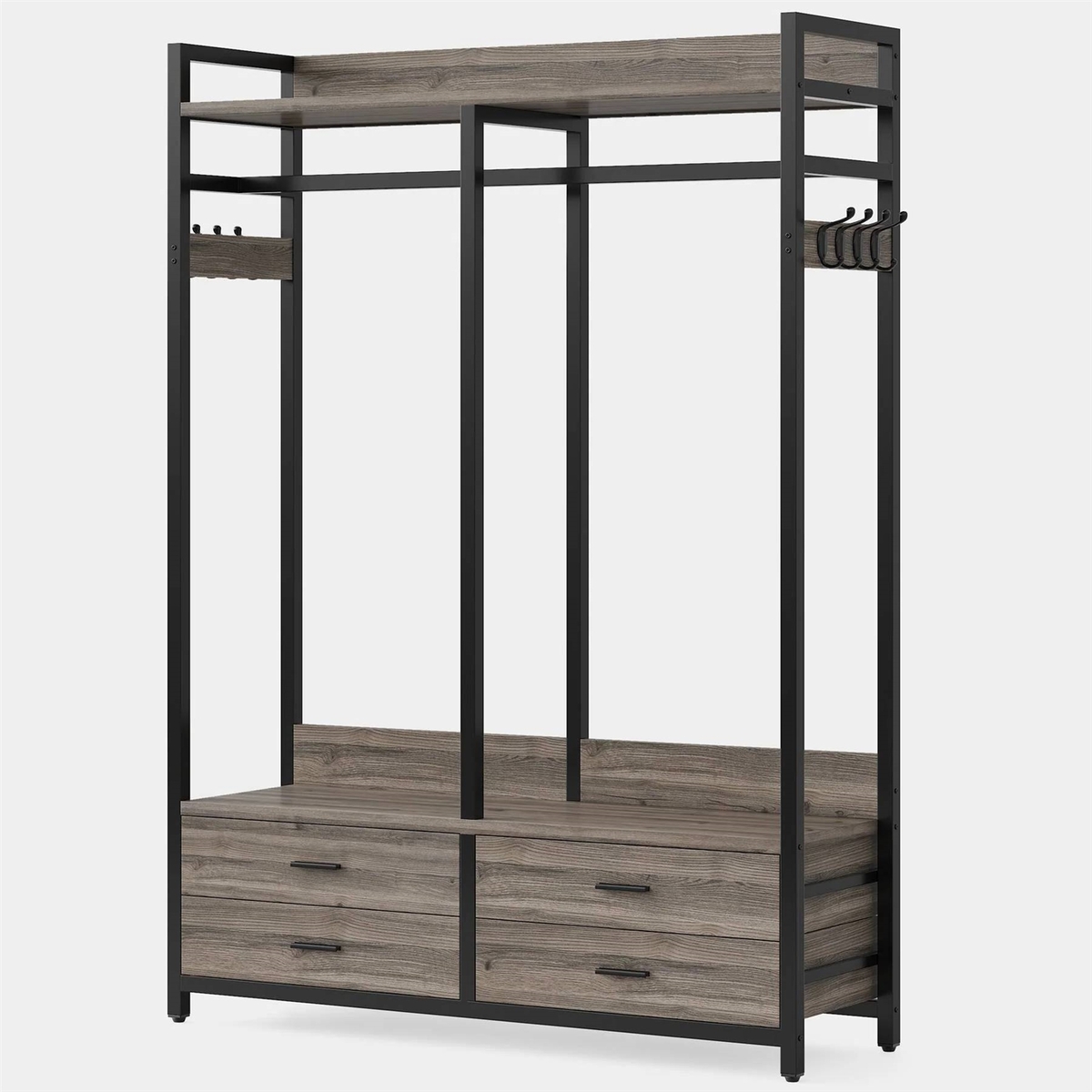 Modern Grey Black Garment Rack with Clothes Hanging Rod and 4 Storage Drawers All needed assembly tools come with the freestanding closet organizer Ready, set, get organized! Material: E0-Graded Board + Metal UNIQUE 4-DRAWER DESIGN STRONG BEARING CAPACITY RETRO INDUSTRIAL STYLE PURCHASE WITH CONFIDENCE GOODBYE CHAOS