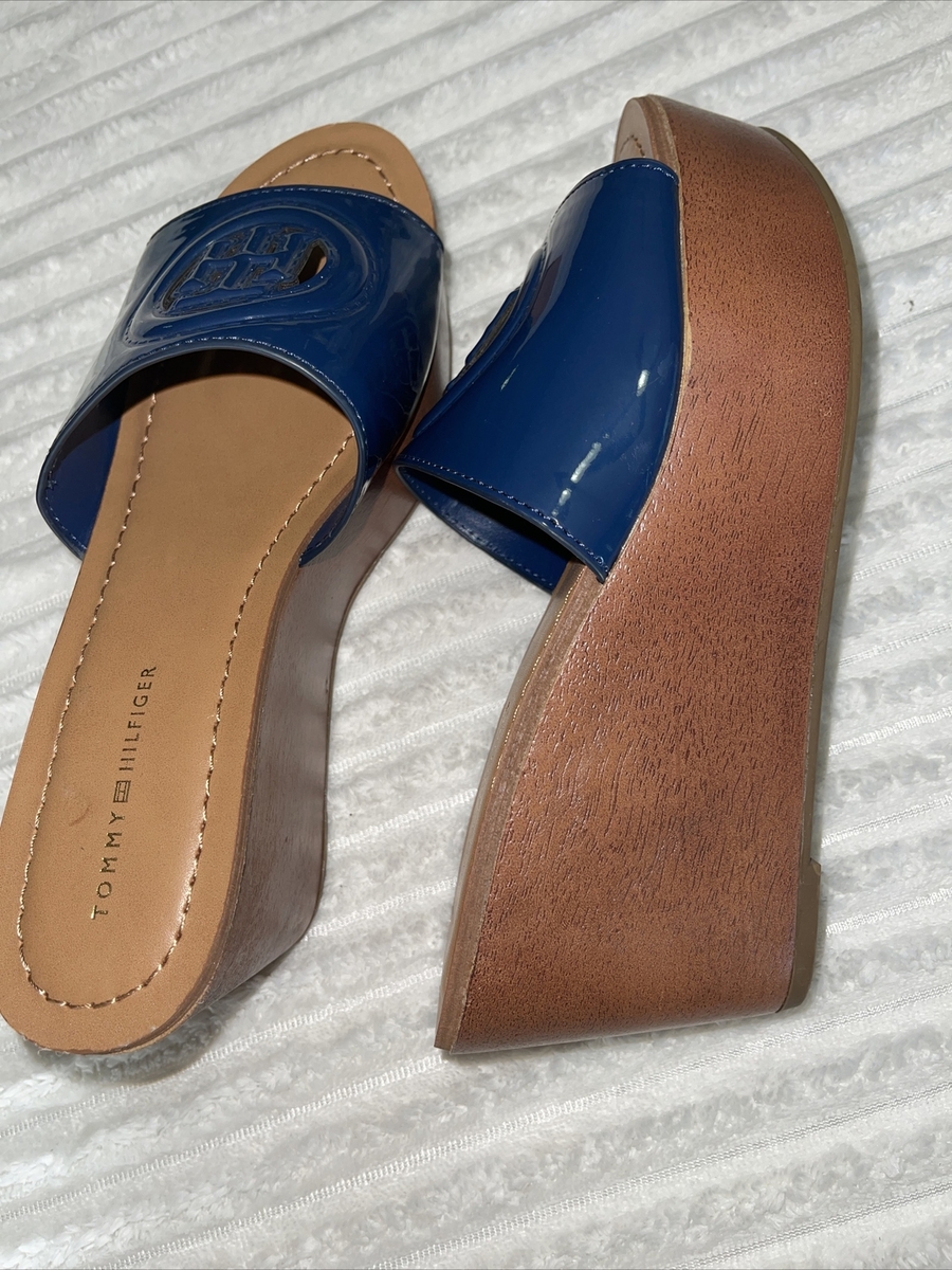TOMMY HILFIGER Brynn Platform Wedge blue LOGO Sandal SZ 8.5 NEW