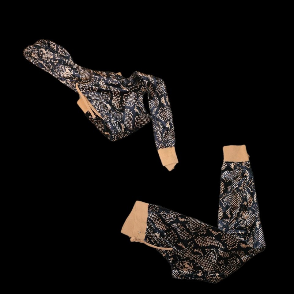 Stylish snake print tracksuit. Features a hood and drawstring. Comfortable fit with elastic cuffs
