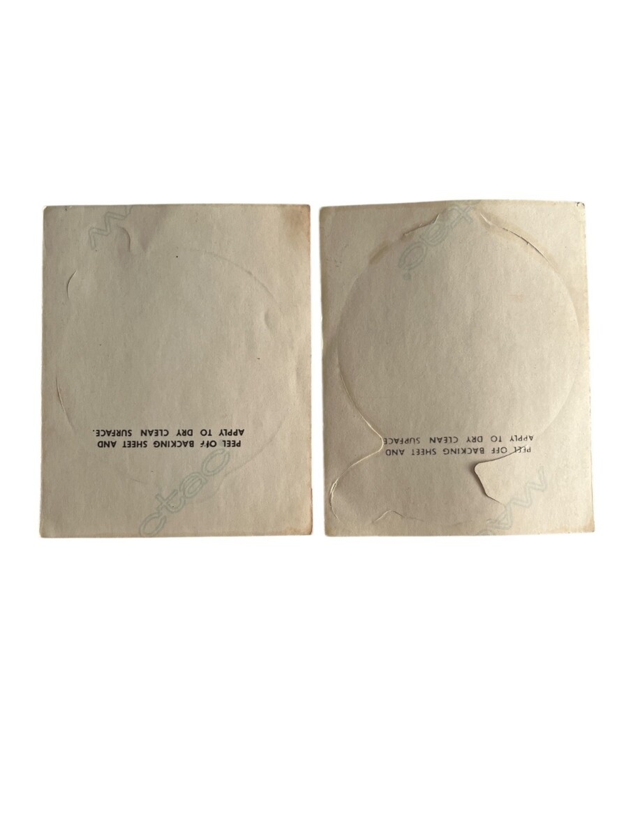 Good vintage condition. Stickers remain intact and unpeeled. Backing papers show age-related wear including light discoloration, minor creasing, edge wear, and adhesive shadowing consistent with vintage paper stickers. No major tears or missing areas. Please review photos closely for condition details.