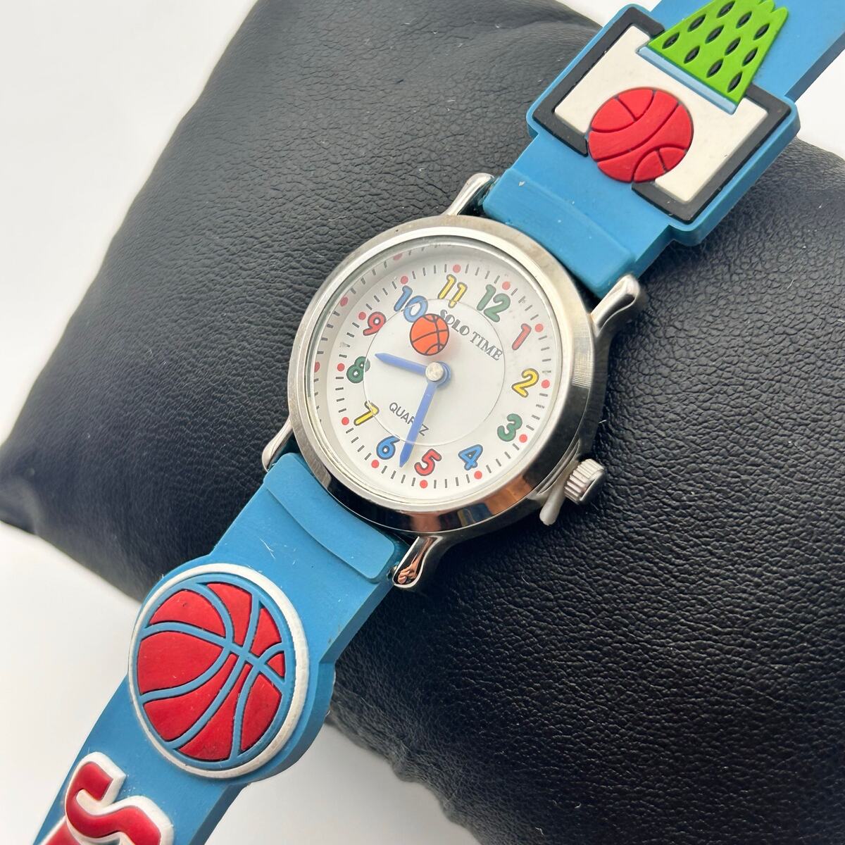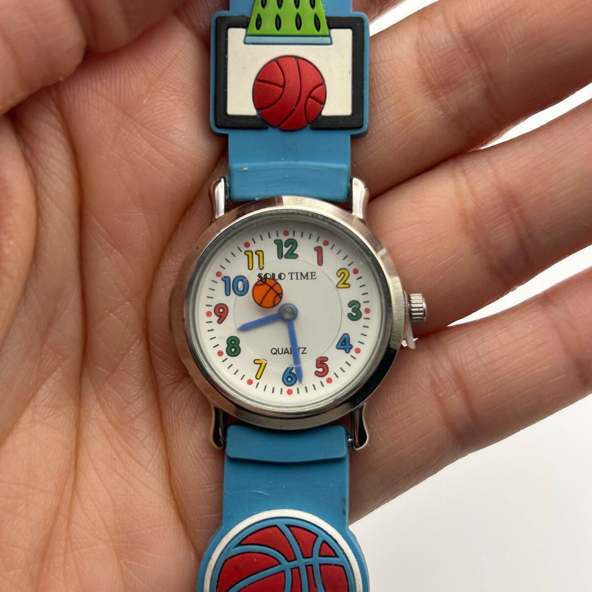 This SOLO TIME kids watch is perfect for your little basketball fan! It features a silver-tone case, a blue silicon strap, and a fun basketball design.