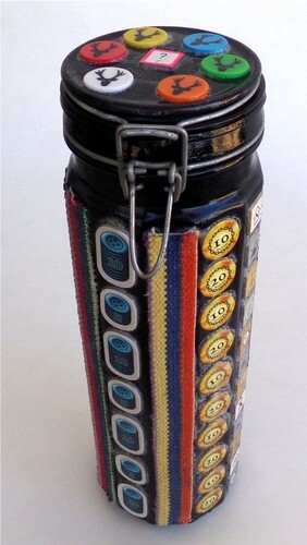 This product is a decorative copper bottle hand-painted in multicolor with a capacity of 950 ml/33 oz. It can be used for water storage or as a yoga bottle. The item is 10.5 inches tall and 3 inches wide, and it features a decorative design. The bottle is made in India and sold as a single unit. It is suitable for any room and can be used as a decorative accessory in home decor.