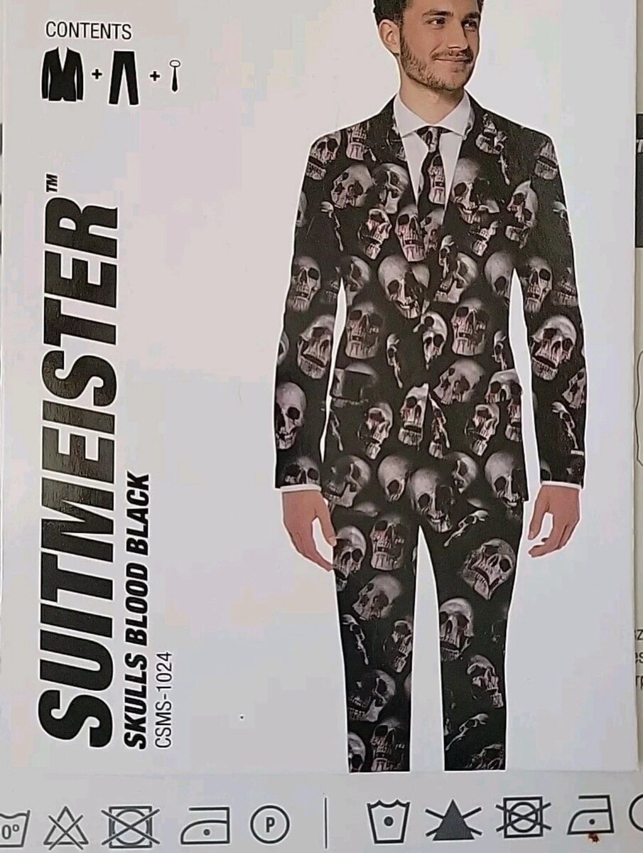 Get ready for Halloween with this Suitmeister Skulls 3 Piece Suit, perfect for any spooky occasion. The suit features a skull and blood pattern, with a black polyester material and regular fit. It includes a jacket, tie and pants, all in size small