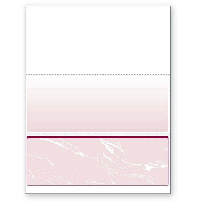 Description: Paris DocuGard Standard security business bottom check paper in burgundy color has 24 lbs paper weight and is ideal for inkjet/laser printers. 8 1/2 x 11 Paper with marble check pattern is used in payroll/accounts payable, sold as OS/White per case..Size: 8 1/2 x 11.Paper Weight: 24 lbs..Check pattern: Marble.Perforations: HPerf at 3 1/2 and 7 from top.Grain direction: Grain long.Pack method: Cutsize in packages in cartons on a pallet.Machine compatibility: Inkjet printers, laser printers.OS/White sheets per case.Application: Payroll, accounts payable.Incorporates security features recommended by the national check fraud center.Compatible with most accounting and money management software packages including Quicken, Quickbooks, PeachTree and Microsoft money.Security features include check-21 compliancy, void pantograph behind endorsement, security warning, void when copied, anti-splice backer, security features listing box, watermarks, check verification number, coin reaction.Compliance standards: CPSA compliant.Paris DocuGard 24 lbs. Standard Security Business Bottom Check Paper is great for banks and credit unions, and is compatible with most accounting and money management software packages. Attributes: Color: Burgundy