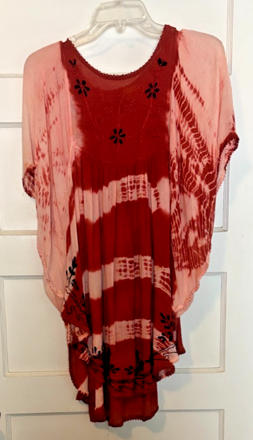 Sunflower Chic Women's Red and Pink Blouse Free Size. Elevate your style with this chic women's blouse in vibrant red and pink. Perfect for adding a pop of color to your wardrobe. There are no fiber content tags, but it looks like a gauzy cotton and feels like rayon. I would recommend hand washing. Armpit to armpit is approximately 21?. Batwing sleeves. Shoulder to hem is 33?. Very Good Used Condition See photos for further description.