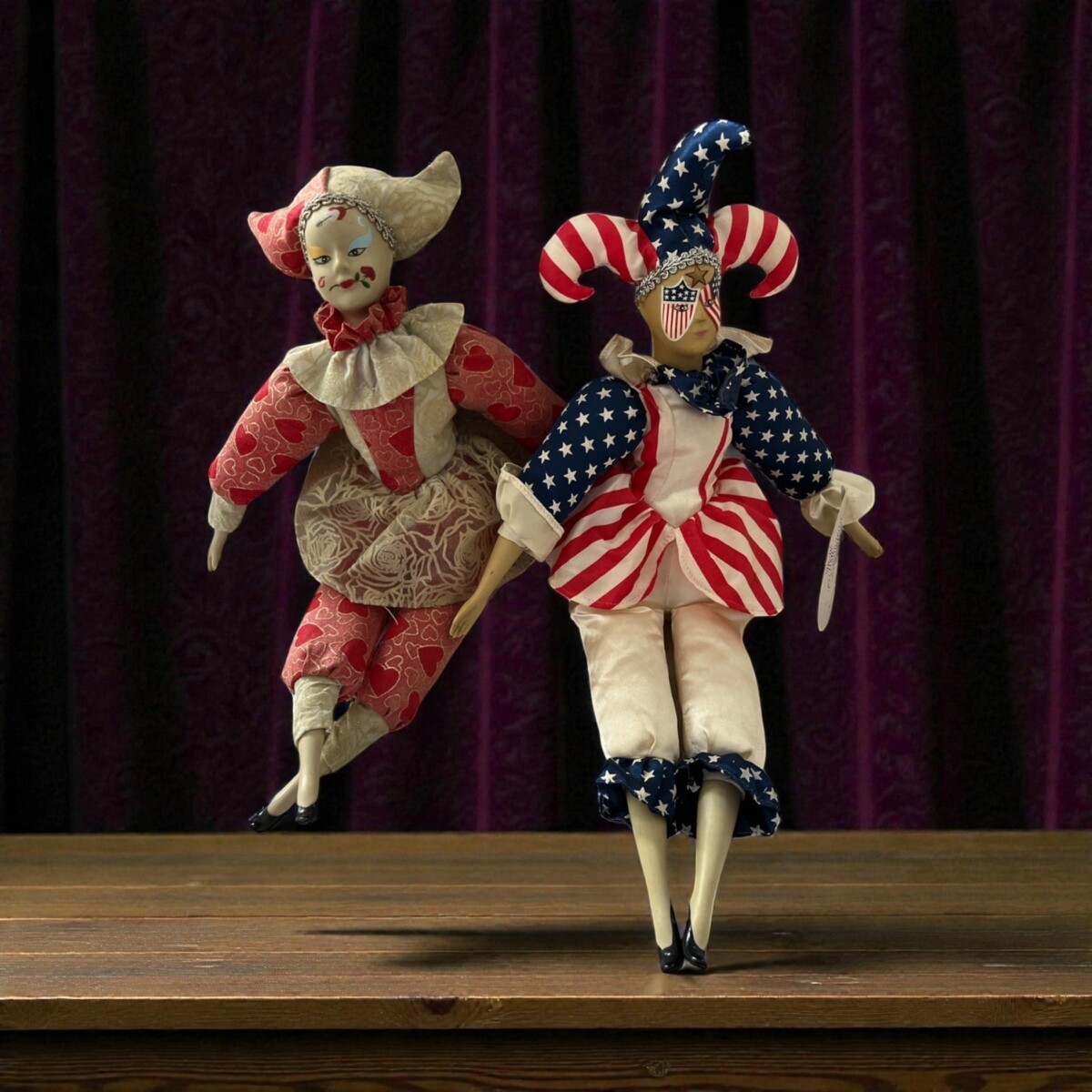 One jester is dressed in a Valentine-themed red and gold heart motif with lace overlay skirt, measuring approximately 16 inches tall. The second jester features a patriotic red, white, and blue American flag design with star and stripe fabrics, measuring approximately 18 inches tall.